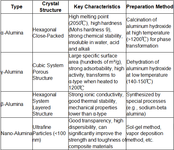 Alumina Powder ၏အဓိကအမျိုးအစားခွဲခြားမှုသည်၎င်း၏ Crystal ဖွဲ့စည်းပုံနှင့်ပြင်ဆင်မှုလုပ်ငန်းစဉ်အပေါ်အခြေခံသည်။ ဘုံအမျိုးအစားများနှင့်သူတို့၏ဝိသေသလက္ခဏာများသည်အောက်ပါအတိုင်းဖြစ်သည် -